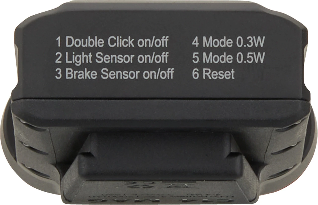 Spezifikationen:Ausführung:Rücklicht (rot)Montage:Magnethalterung an den SattelstrebenLeuchtmittel:LED (14 x COB)Leuchtdauer:bis 22:00 StundenBetriebsmittel:Akku (Li-Po), integriertTechnische Daten:Leuchtmodi:Dauerlicht, Bremslicht, Blink- und PulsmodusLadezeit:3:00 StundenSchutzklasse:IP68, IK09Maße (H x B x T):26 x 40 x 71 mmMaterial:AluminiumSchalter:Ein- / Aus-Taster an der UnterseiteFeatures:Rücklicht mit Magnethalterung zur Befestigung zwischen den Sattelstreben45 Lumen hellBremslichtfunktionLichtsensor ermöglicht automatisches Ein- und Ausschalten je nach Umgebungslichthomogene Leuchtcharakteristik240° Abstrahlwinkel für rundum gute Sichtbarkeitintegrierter Akku 4,4 Whschlag- und wasserfest nach IP68 und IK09kompatibel mit allen genormten Sattelstrebenabständen (ca. 35 mm)Hinweis:Der zur Montage benötigte Mindestabstand zwischen Sattel und Sattelstreben beträgt 21 mm.